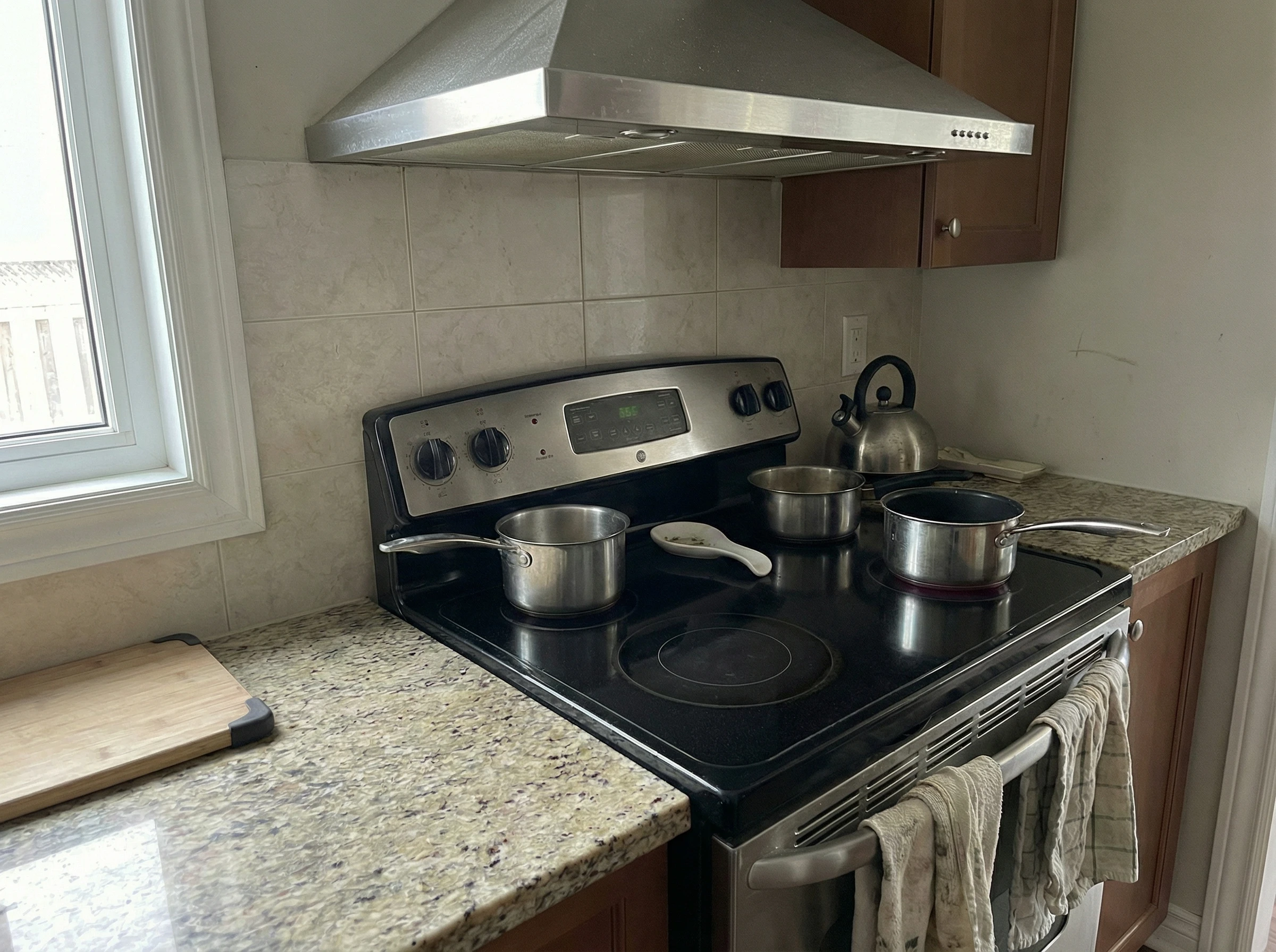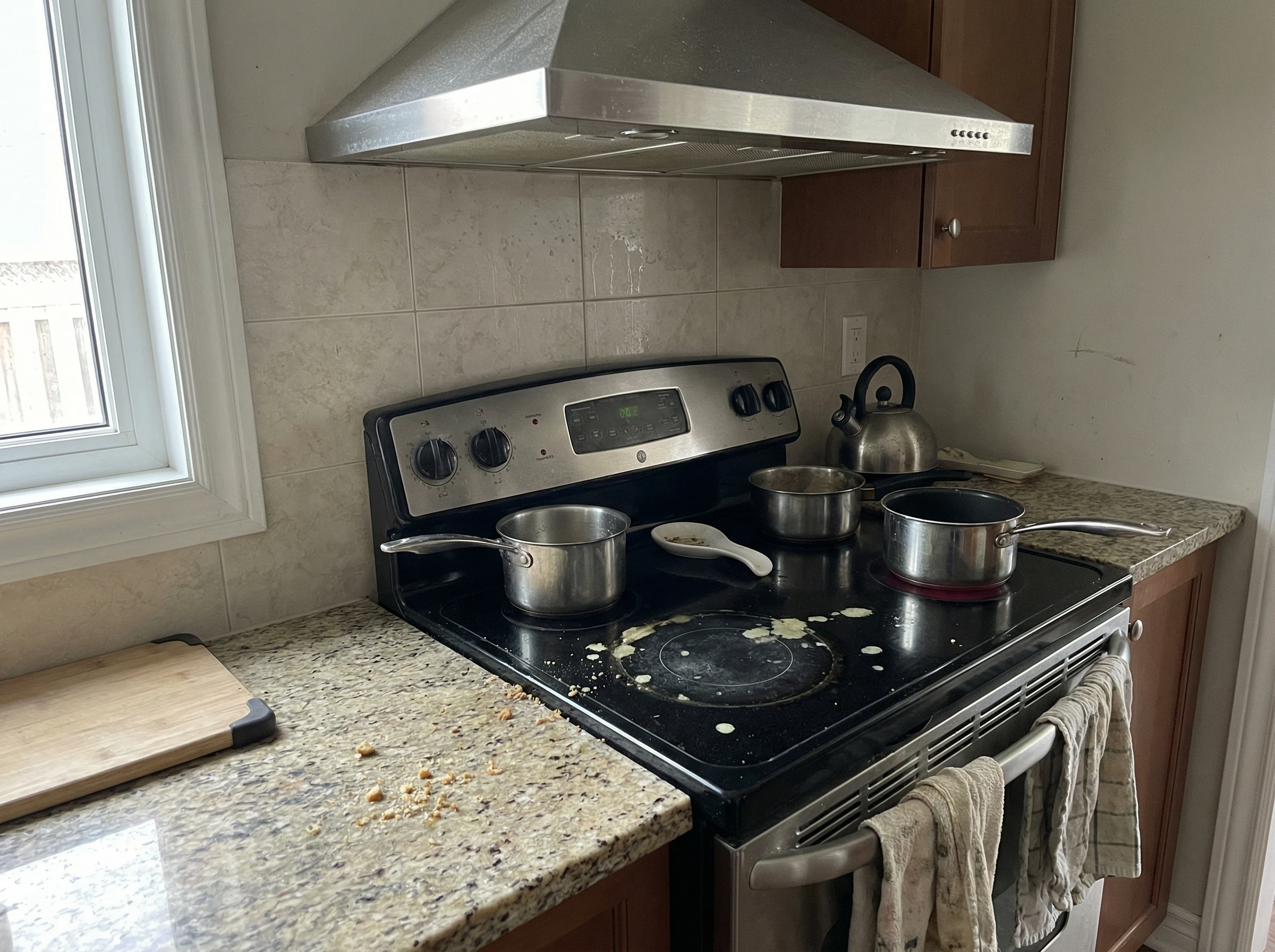 - Heavy kitchen grease buildup on range hood, backsplash, and cabinet interiors from 18 months of frequent cooking